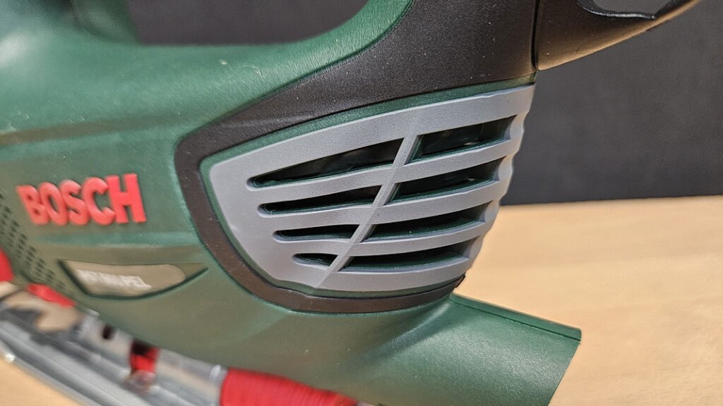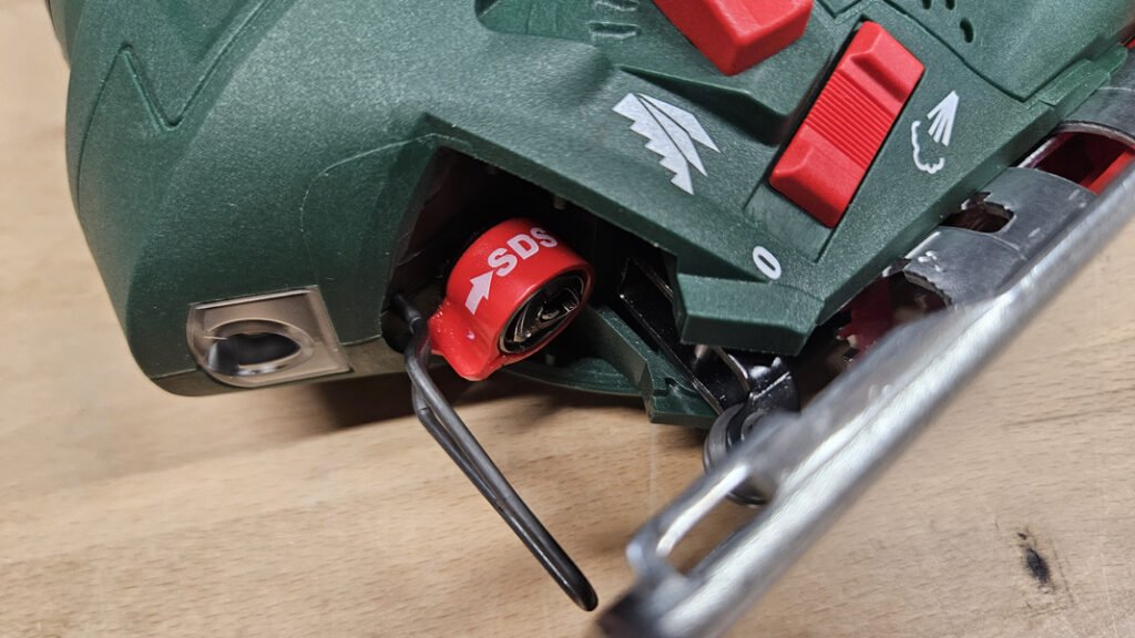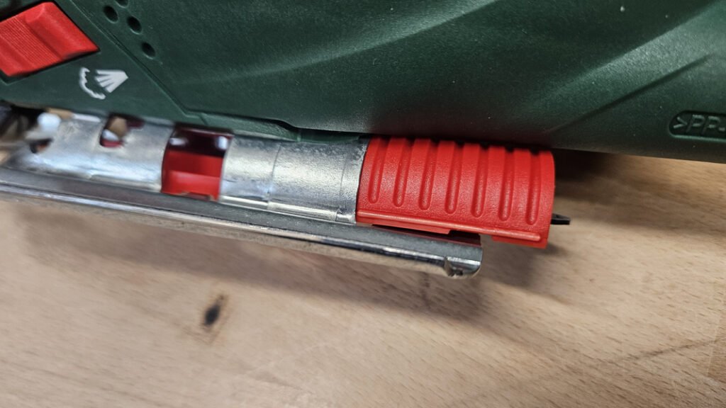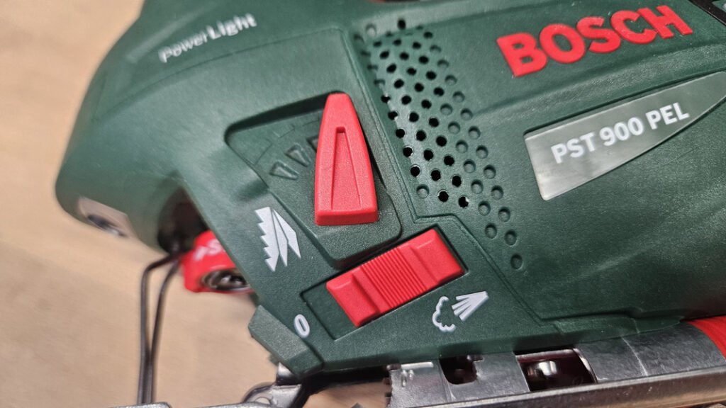 La scie propose plusieurs réglages utiles au quotidien, comme le variateur qui permet d’ajuster la vitesse de coupe, avec une plage allant de 500 à 3100 courses par minute. Le mouvement pendulaire dispose de 4 positions, pratique pour privilégier soit la rapidité d’avance dans le bois, soit une coupe plus propre lorsque l’on réduit l’action pendulaire. La soufflerie peut quant à elle être activée afin de dégager le trait de coupe et améliorer la visibilité.