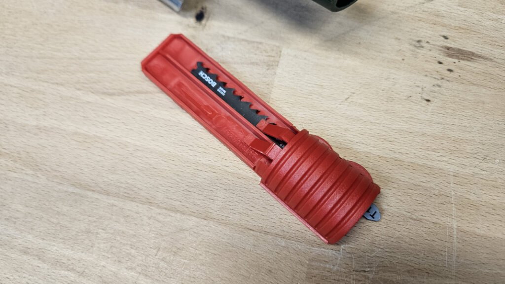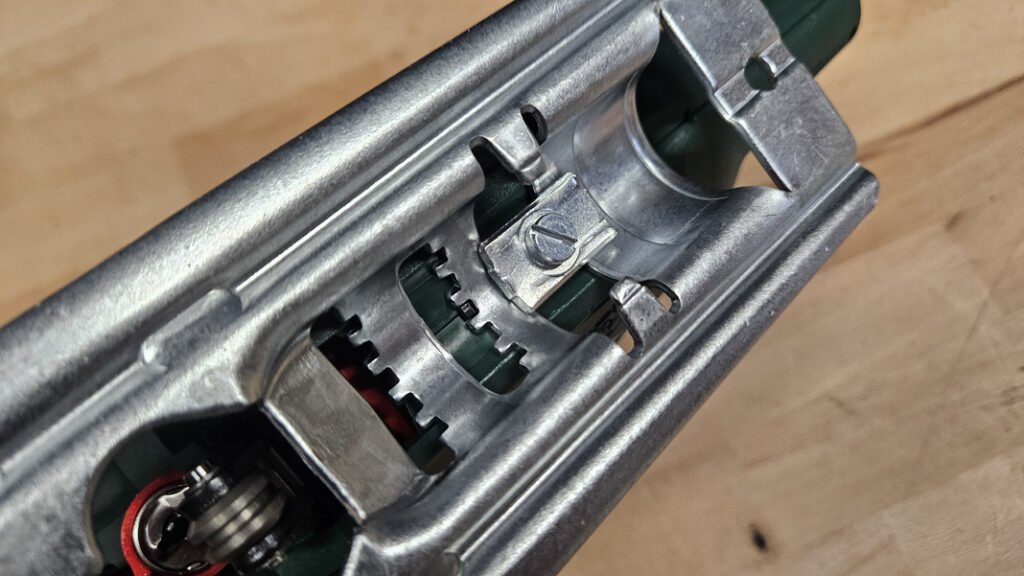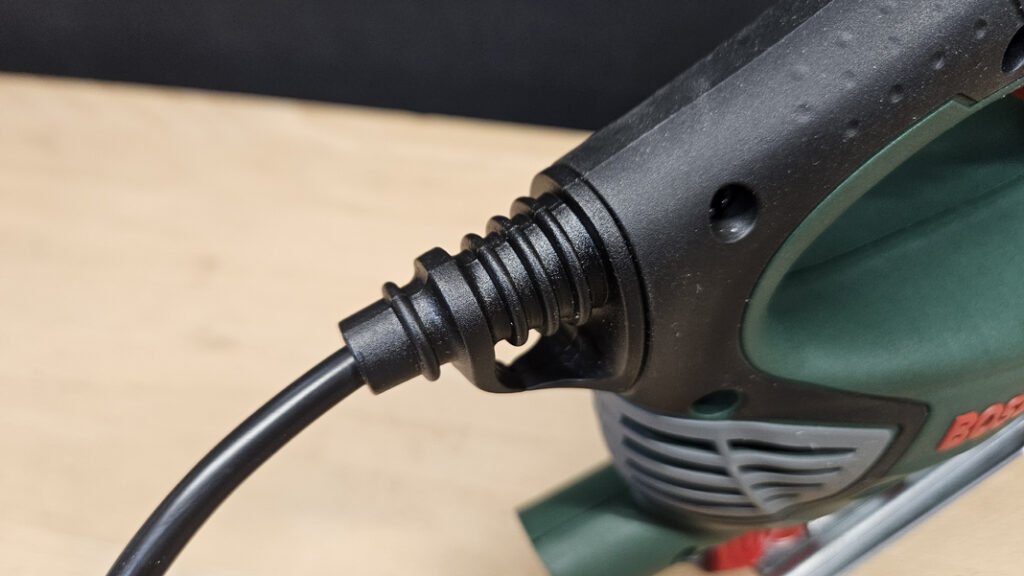 Cette scie sauteuse fonctionne sur secteur, avec un câble d’environ 2 m. Bosch a prévu un renfort à la sortie du carter afin de limiter les contraintes mécaniques sur cette zone souvent sollicitée. L’intérêt principal reste la stabilité de la puissance : pas de baisse de régime liée à l’état de charge, ce qui est appréciable lors de découpes longues ou lorsqu’il faut maintenir une cadence régulière sur des matériaux plus denses.