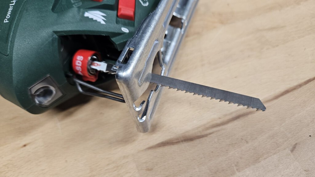 Avec 620 W, la PST 900 PEL se place dans le haut du panier des modèles filaires grand public de la marque. La vitesse est réglable de 500 à 3100 courses par minute, via un variateur, ce qui permet d’adapter le rythme à la nature du matériau et au type de coupe recherché. La longueur de course de 23 mm est cohérente avec les standards du marché et participe à un bon rendement dans le bois. En pratique, la machine réalise des coupes nettes et sans difficulté dans du médium de 18 mm, et conserve une bonne aisance dans des pièces de bois plus épaisses, à condition d’utiliser une lame adaptée.