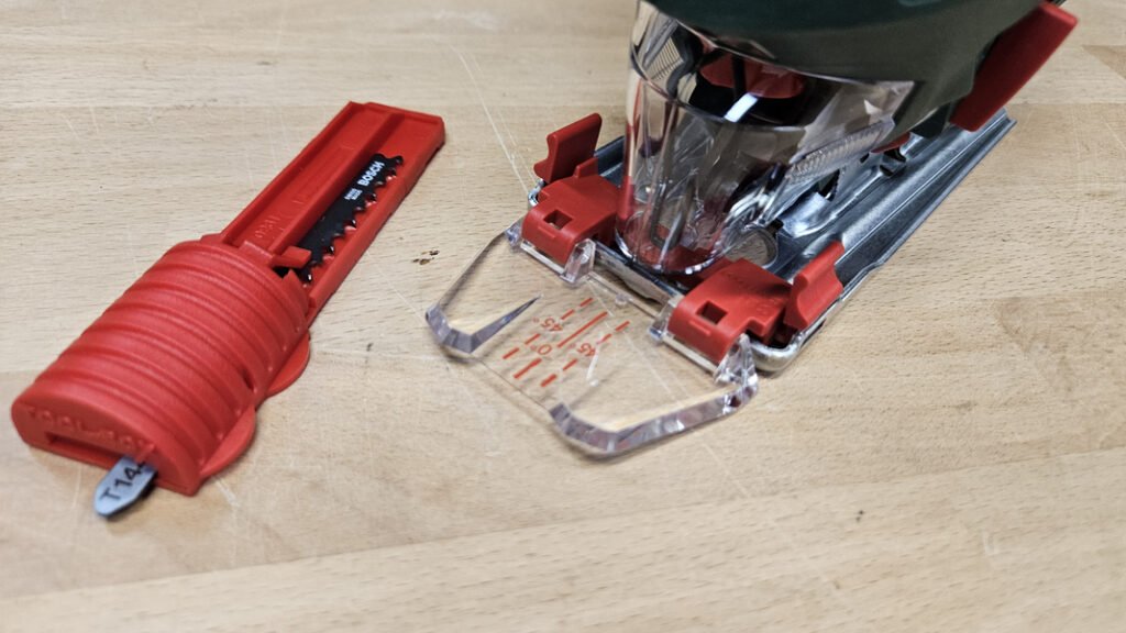 Le changement de lame est particulièrement rapide : l’insertion se fait en butée contre le galet, et un levier permet ensuite l’éjection de la lame sans contact direct. C’est un vrai gain de temps, surtout lorsqu’il faut alterner bois et matériaux dérivés, ou adapter la denture en fonction de l’épaisseur.