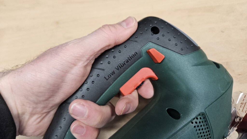 Le poids d’environ 2,1 kg se ressent si la machine est utilisée à bout de bras, mais reste logique pour une scie sauteuse filaire de cette puissance. La poignée bénéficie d’un grip confortable sur une large zone, ce qui améliore le contrôle et limite la fatigue. La gâchette tombe bien sous le doigt et peut être actionnée avec un ou deux doigts selon la situation. Un bouton de blocage permet de verrouiller la commande en fonctionnement pour les longues découpes, ce qui évite de maintenir une pression continue sur la gâchette.