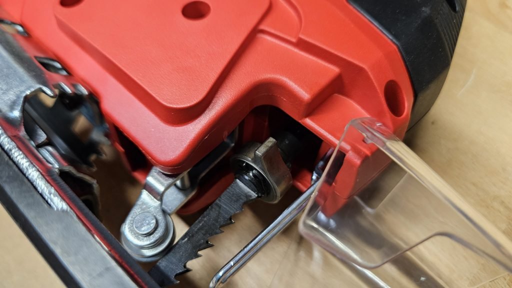 Le changement de lame s’effectue sans outil, un vrai plus sur une scie de cette gamme. Il suffit de soulever le capot, de tirer la bague de blocage, puis d’insérer la lame jusqu’en butée. Pour retirer la lame, il suffit de tirer à nouveau la bague, ce qui va littéralement éjecter la lame, un système simple, rapide et efficace.