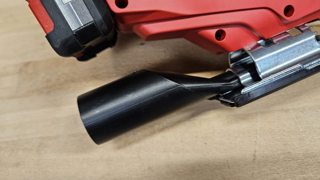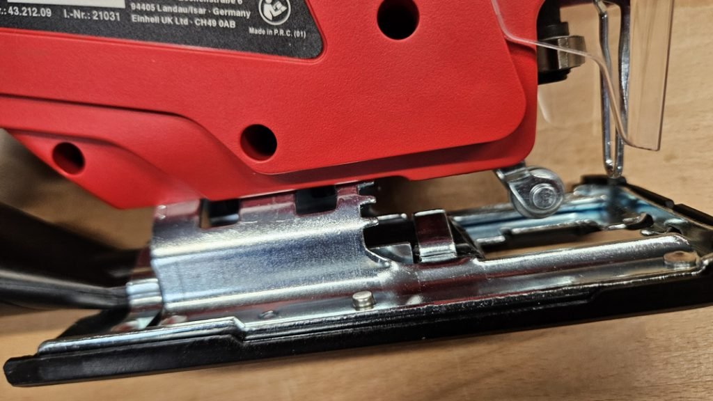 La Einhell TC-JS 18 Li est équipée d’un conduit d’aspiration permettant de raccorder un aspirateur de chantier. Ce système permet de maintenir une zone de coupe propre, même si la machine ne dispose pas de fonction soufflerie intégrée. Le pack comprend également un pare-éclats transparent qui améliore la visibilité sur le trait de coupe, un petit détail toujours appréciable lors des découpes précises.