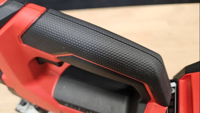 Avec ses 2,2 kg (hors batterie), la scie sauteuse affiche un poids légèrement supérieur à certains modèles concurrents. Cela dit, en utilisation, le poids repose essentiellement sur le support, ce qui limite la fatigue. Sa poignée fine, couverte d’un grip texturé, assure une bonne tenue en main, et la gâchette bien placée tombe naturellement sous les doigts. Le confort d’utilisation est au rendez-vous, même pour des coupes prolongées.