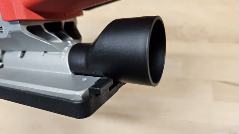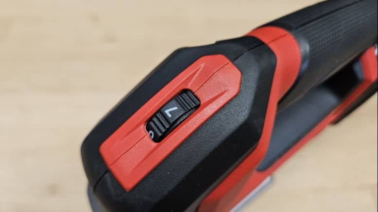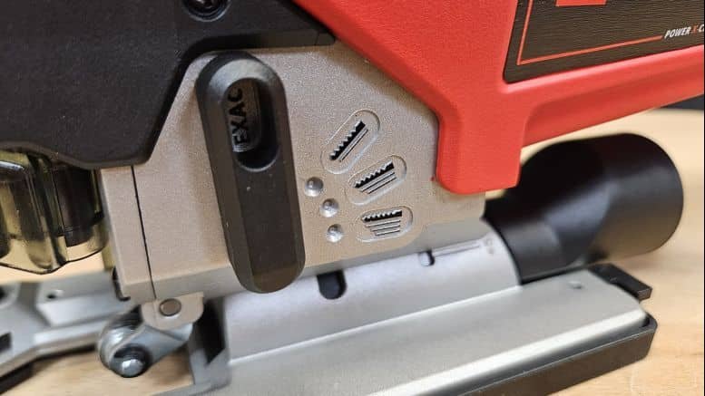 Avec ses 2,2 kg (hors batterie), la scie sauteuse affiche un poids légèrement supérieur à certains modèles concurrents. Cela dit, en utilisation, le poids repose essentiellement sur le support, ce qui limite la fatigue. Sa poignée fine, couverte d’un grip texturé, assure une bonne tenue en main, et la gâchette bien placée tombe naturellement sous les doigts. Le confort d’utilisation est au rendez-vous, même pour des coupes prolongées.