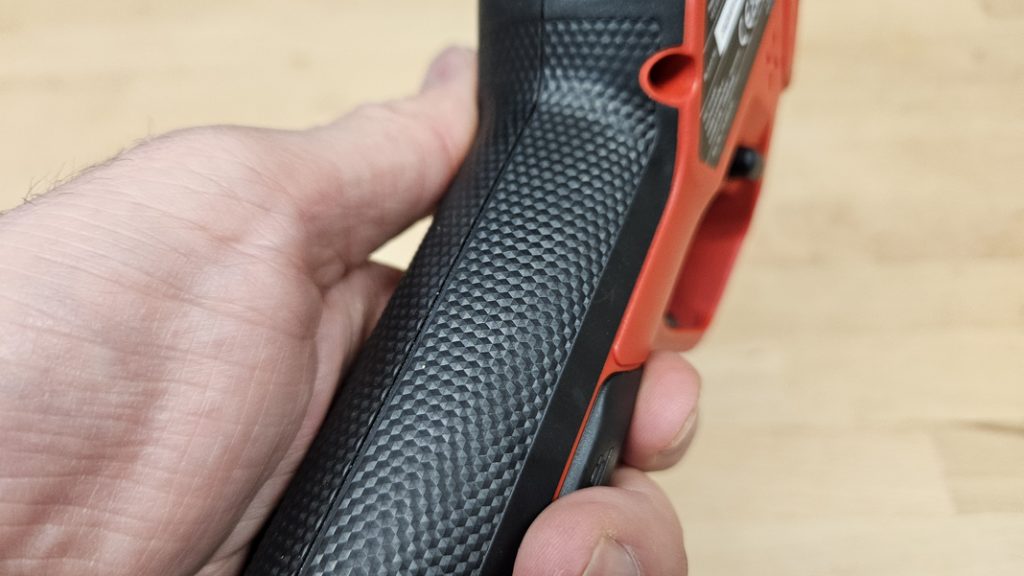 Avec un poids de 835 g sans batterie, le GP-LS 18/28 est relativement léger pour un sécateur électrique. La prise en main est bonne, grâce à une poignée recouverte d’un grip efficace. La gâchette tombe bien sous les doigts, tout comme le bouton de sécurité. L’ergonomie est bien pensée et permet un usage prolongé sans fatigue.