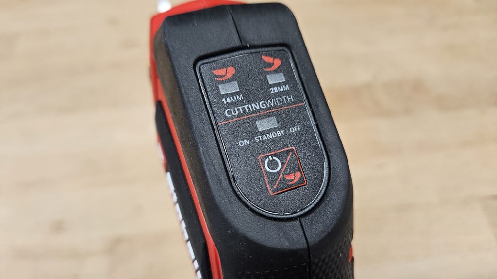 Ce sécateur offre un accès rapide à ses fonctions via un bouton de commande sur le dessus. Un appui permet d’allumer l’appareil, deux appuis sur la gâchette permettent d’activer la lame, puis on choisit la position 1 (14 mm) ou 2 (28 mm) selon le travail à effectuer.