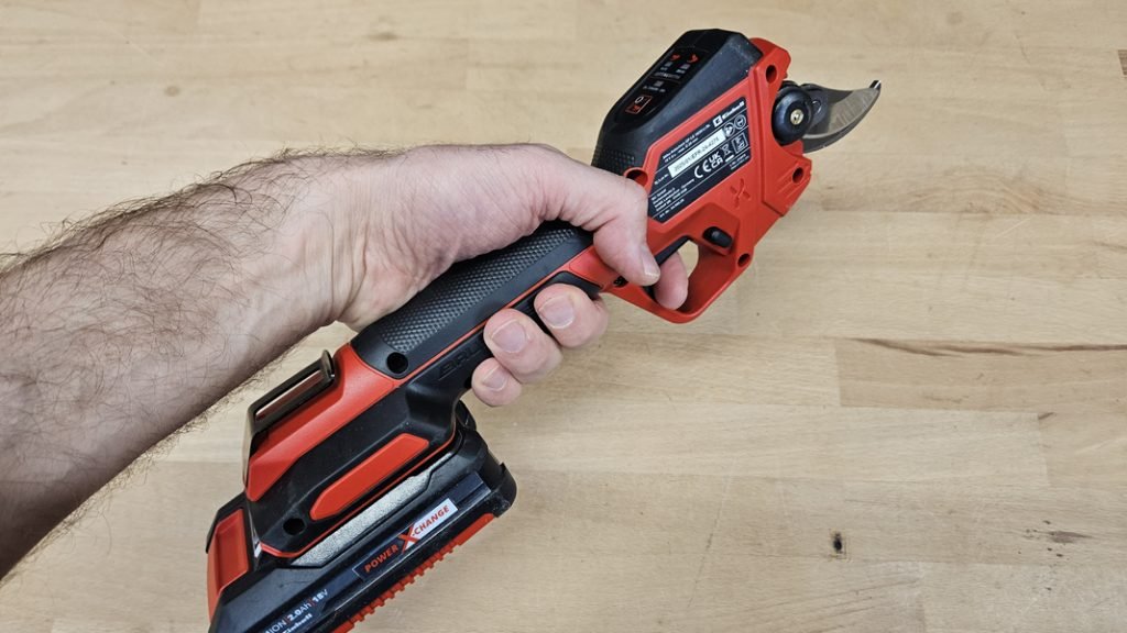 Avec un poids de 835 g sans batterie, le GP-LS 18/28 est relativement léger pour un sécateur électrique. La prise en main est bonne, grâce à une poignée recouverte d’un grip efficace. La gâchette tombe bien sous les doigts, tout comme le bouton de sécurité. L’ergonomie est bien pensée et permet un usage prolongé sans fatigue.