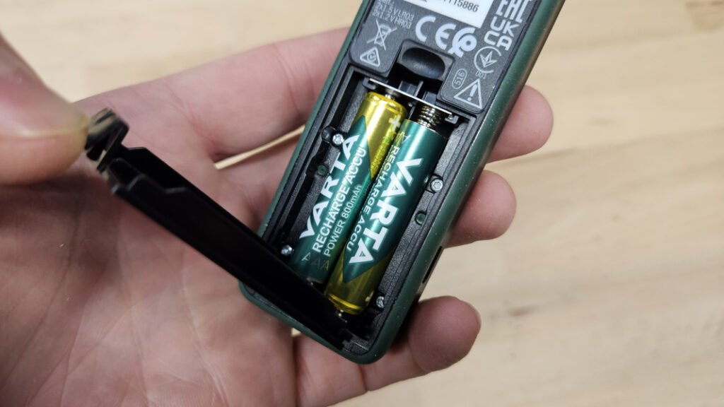 Le Zamo fonctionne avec deux piles au format AA. Point appréciable, il est livré avec des accus rechargeables et dispose d’un port USB-C pour la recharge directe des batteries lorsqu’on utilise des AA NiMH. Ce double mode d’alimentation apporte de la souplesse : on peut utiliser des piles alcalines standards, ou privilégier les accus pour limiter les consommables et conserver un coût d’usage très faible. De plus, un indicateur de niveau de charge apparaît à l’écran pour anticiper les recharges.