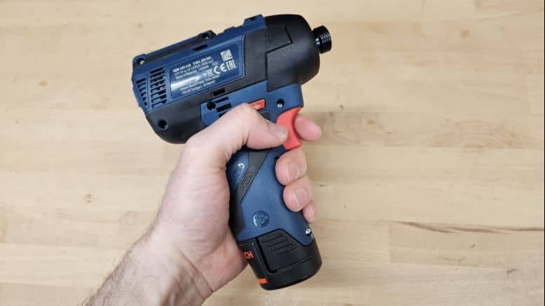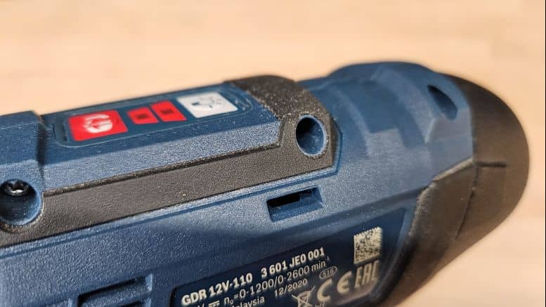 La poignée est ergonomique avec un revêtement grip partiel à l’avant et à l’arrière. Même si ce grip n’est pas complet, la tenue en main reste très correcte. Les boutons (gâchette et inverseur de sens) sont bien positionnés et facilement accessibles.