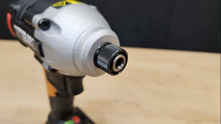 La sélection du mode se fait via un bouton bien situé à l’arrière de la machine. Les transitions entre les vitesses sont fluides et peuvent se faire sans interrompre le travail. Le porte-embout hexagonal 1/4″ est équipé d’une bague de verrouillage. L’insertion est sécurisée et l’extraction manuelle reste simple, même si l’on regrette l’absence d’un ressort d’éjection automatique, utile pour gagner en rapidité.